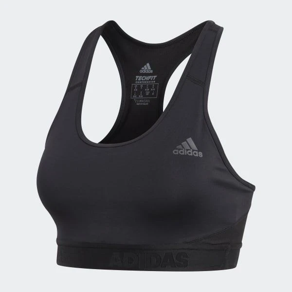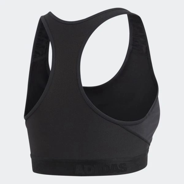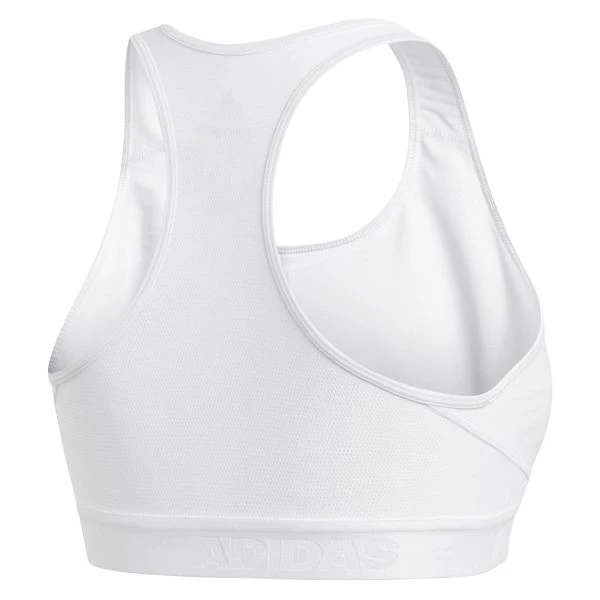 This sports bra helps keep everything in place so you can focus on your workout. The stretchy knit bra has a compression fit that offers medium support. The mesh panel in back keeps air circulating to cool you down. Medium support offers a close fit with compression and a pullover design. Scoop neck & racer back design. 83% recycled polyester / 17% elastane double knit. adidas have created Alphaskin for a locked-in feel.